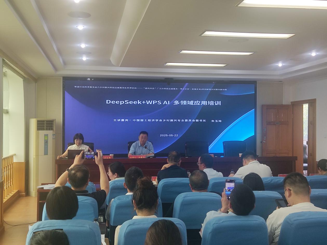 本网讯 2025年5月22日,由中国国土经济学会主办,智惠行动科普服务乡村振兴科技志愿服务队与广元市科学技术协会联合承办的"DeepSeek+WPS AI多领域应用培训科技志愿服务活动"在广元市科学技术协会会议室成功举行。本次活动以"智启乡村·创领未来AI科技赋能乡村振兴新动能"为主题,吸引了来自全市7个区县的15名基层科协干部、32家企业科技负责人及企业代表共同参与。
