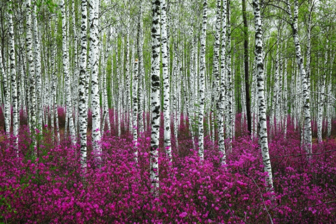 白桦树银白色的树干总是夺人眼目,当它们聚在一起,是那么清雅壮观,好像一群白衣翩翩的雅士。白桦树被称为先锋树,气味可以驱虫,其他树和白桦树在一起可以抗虫。落叶松的树皮发黑,针叶是多针成一簇;樟子松的树皮发红,针叶是两针成一簇。大兴安岭是一片树的海洋,浩瀚无边,树无所不在,人处于树的包围之中,触目都是树。树是风景,也是大兴安岭的主角。绿树覆盖了山峦,改变了山的颜色,绿树包围着流水,染绿了流水。林中万物依附着树生长。远看成群结队的树面目相似,像庞大的队伍浩浩荡荡跨越过山峦河流,气势恢弘。而走近看,每一棵树都是有独特的姿态。这里有原始森林,也有次生林,一年中无霜期在100天内,树的生长期很短。多数的树树干很细。树使劲向上生长,争抢阳光的照耀,所以原始森林的树多长干少长冠,树干很长,到接近顶部才展开树冠。
