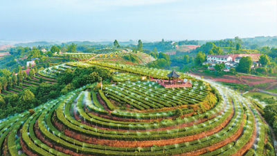 5月5日,四川省宜宾市翠屏区金秋湖镇川茶基地,节水、节能的雾灌系统正在工作中。