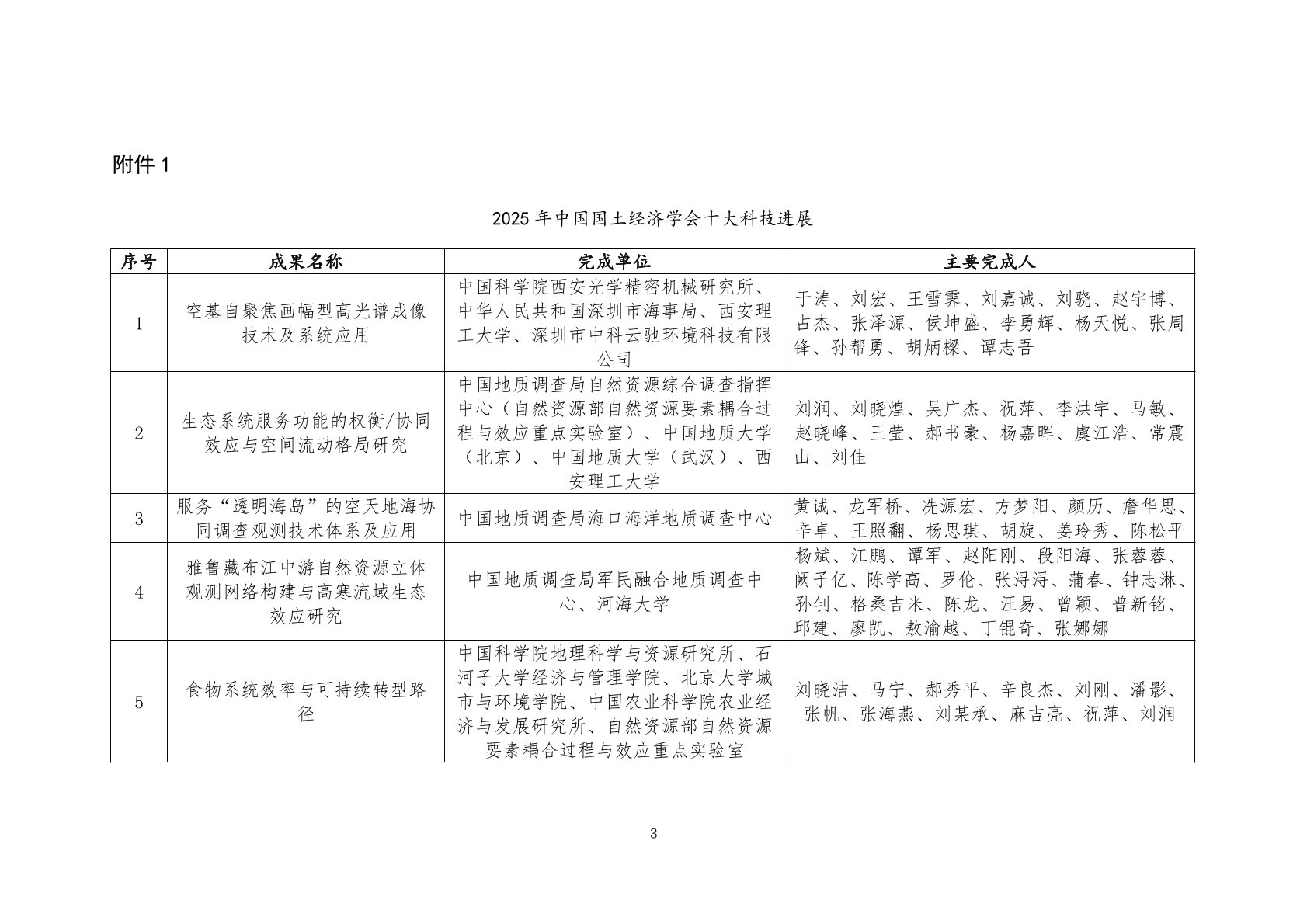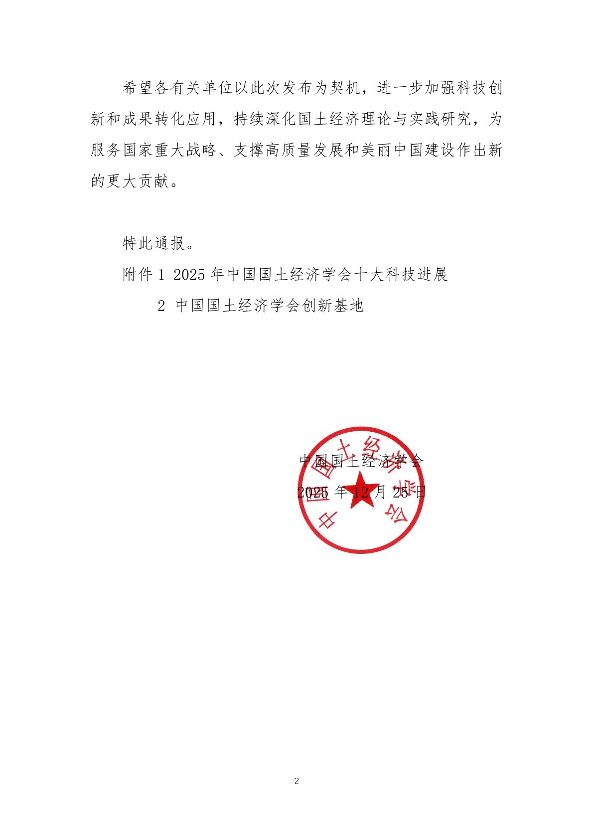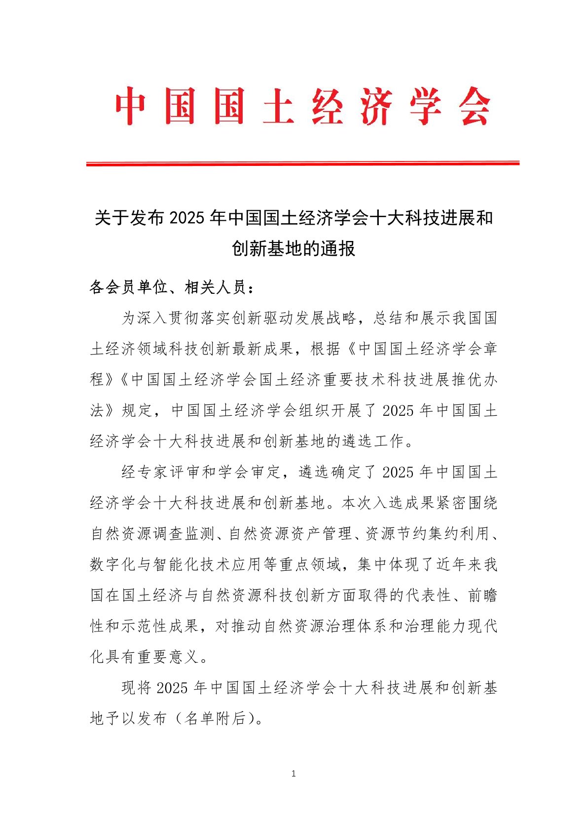 关于发布 2025 年中国国土经济学会十大科技进展和创新基地的通报