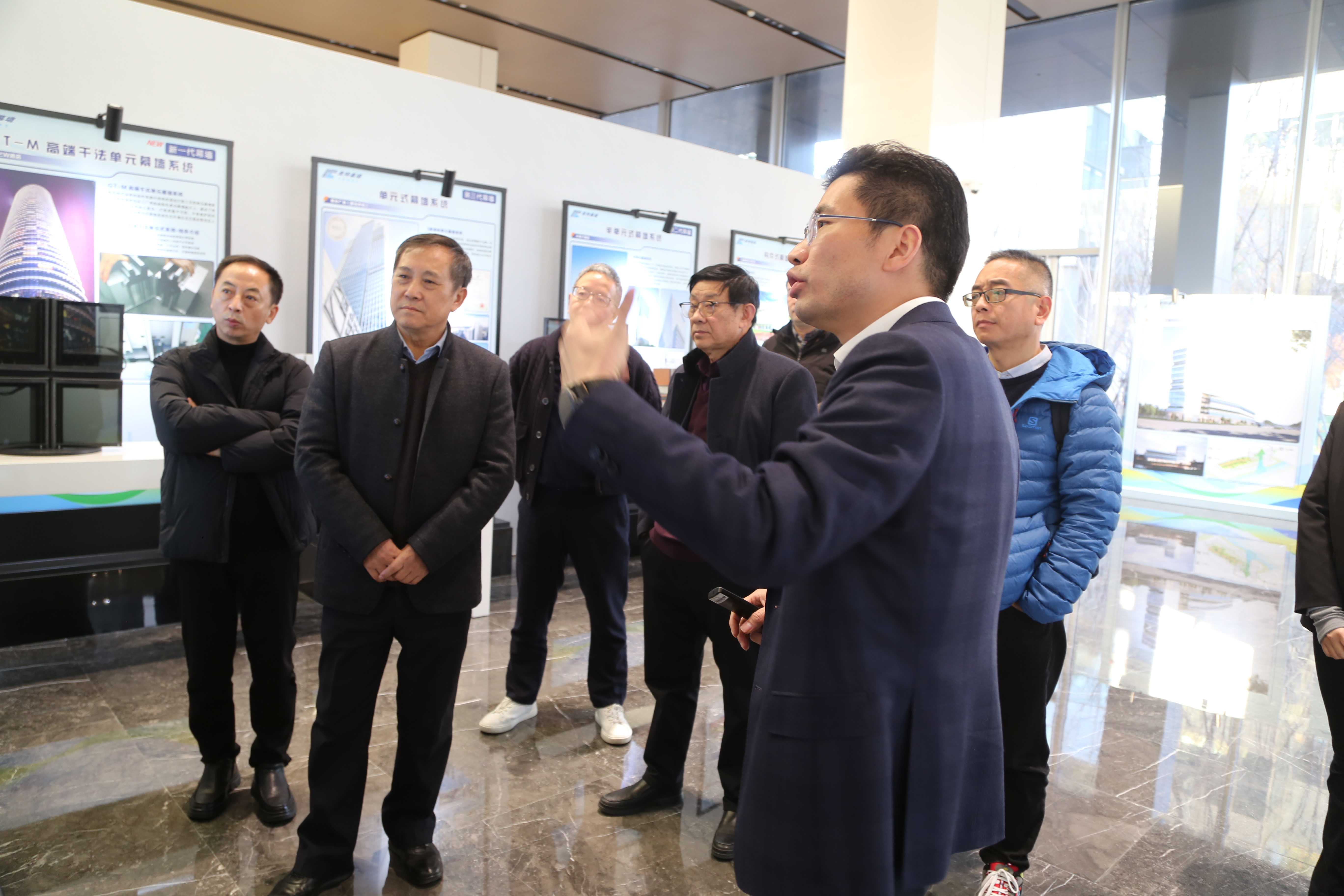 全国“五一劳动奖章”获得者、美特总经理朱齐飞(右三)向幕墙更新委一行介绍企业发展历程及未来规划